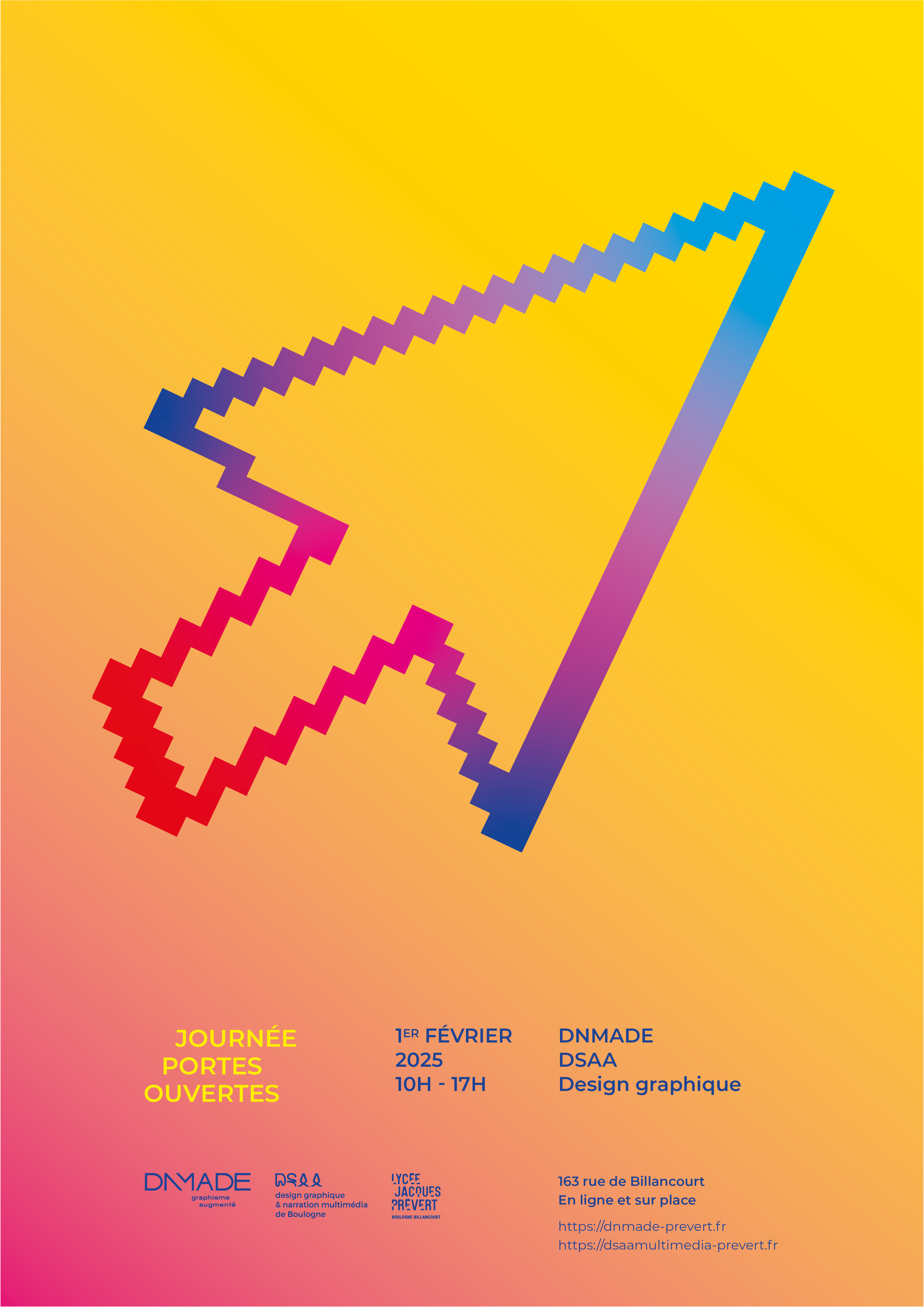 The purpose of this project was to design a poster for the Open Doors Day for DNMADE and DSAA at Lycée Jacques Prévert, specifically for the graphic design and multimedia storytelling courses. It was important for me to convey the versatility of the teaching, by transmitting through the poster that we work with both digital and printed media. Inspired by Swiss design, especially its minimalism, I decided to focus attention on color, form, and simplicity. The cursor, representing everything digital, points upwards towards improvement, just like learning. The vibrant colors attract attention, while the gradient in the cursor reflects the material medium.