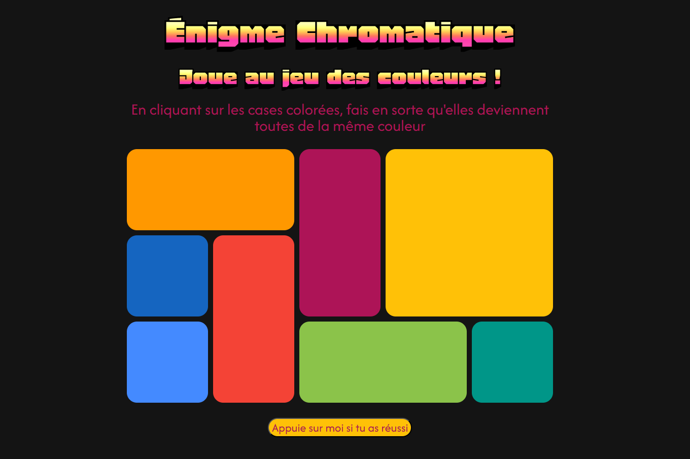 «Énigme Chromatique» — це міні-сайт, адаптований до різних пристроїв, створений із використанням системи сіток (grid), який дозволяє користувачам грати в гру з кольорами, натискаючи на кольорові блоки, щоб зробити всі блоки одного кольору. Простий та інтуїтивно зрозумілий концепт дозволяє користувачам будь-якого віку насолоджуватися грою. Ця гра є чудовим прикладом використання системи сіток у CSS, HTML і JS коді.